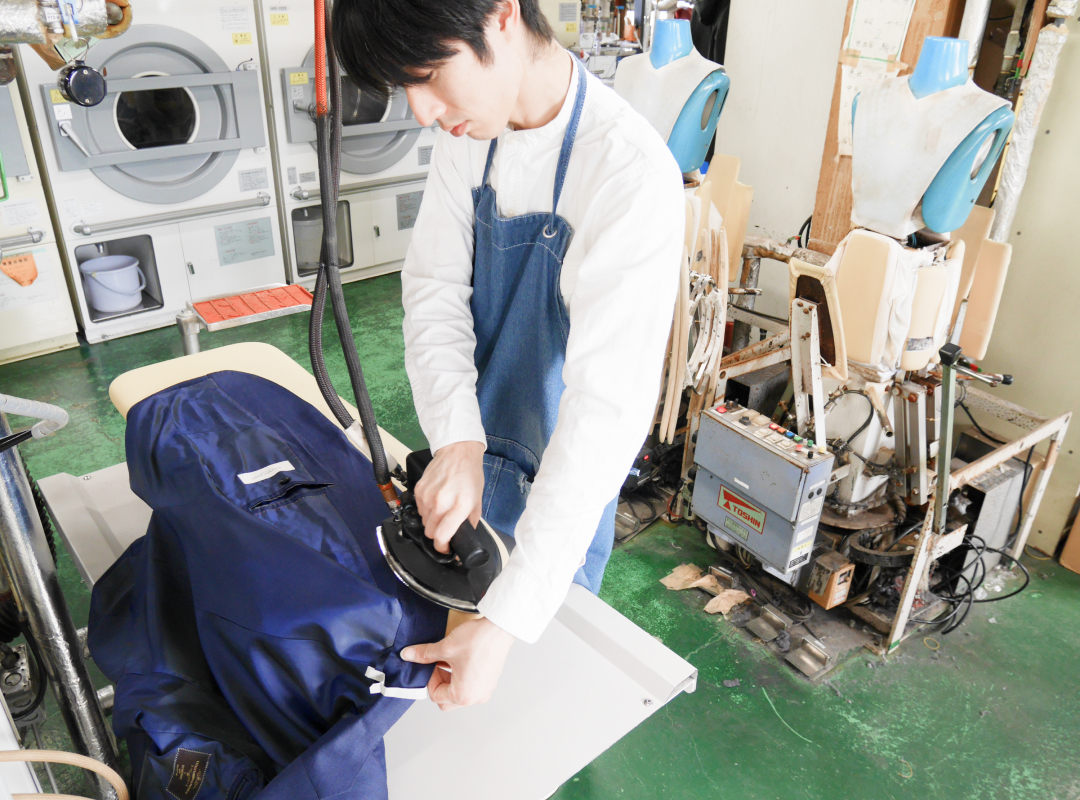 お客様の衣類を新品のような状態でお届けするため、立体仕上げプレス機を使用して復元した後に、アイロンで手直し調整する二段階仕上げを行っています。